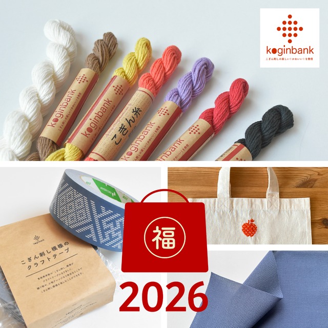 koginbank活動10年目を記念して、デッドストックのオリジナル商品などを集めた福袋。数量限定です。発送は2026年1月3日からになります。 主な内容は ・オリジナルこぎん糸12色 ・綿こぎん布30㎝角相当2枚 ・2026年カレンダー「こぎん刺し模様採集」 ・こぎん刺しキット1~2点 ・こぎん刺し模様のクラフトテープ ・図案カード他 送料込みで総額¥13,000相当の商品をお届いたします。